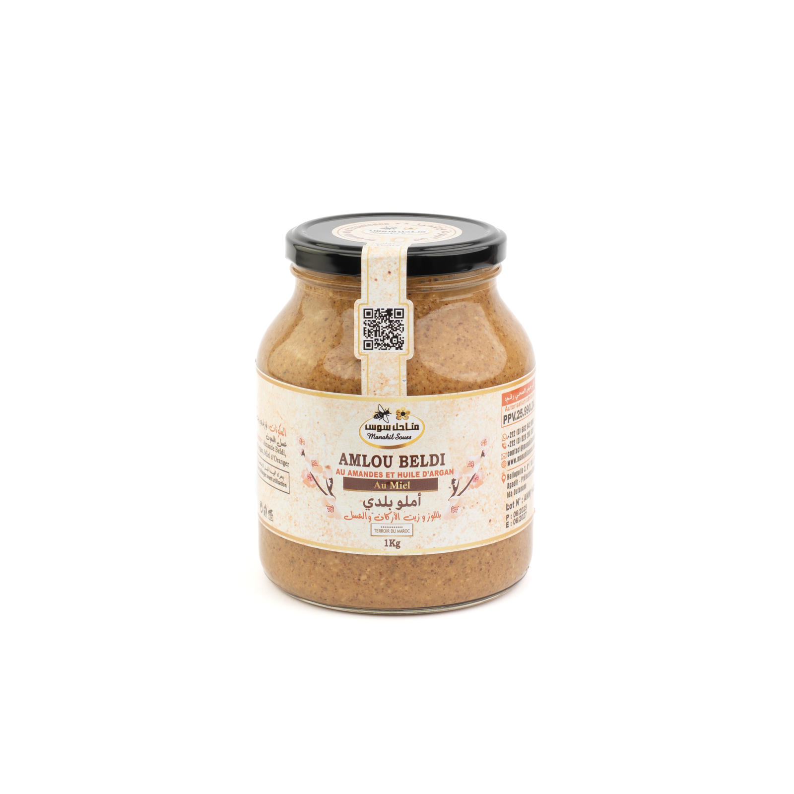 Plongez au cœur de la tradition marocaine avec l’incontournable Amlou beldi, une pâte onctueuse et authentique à base d’amandes torréfiées, de miel pur et d’une touche d’huile d’argan vierge.